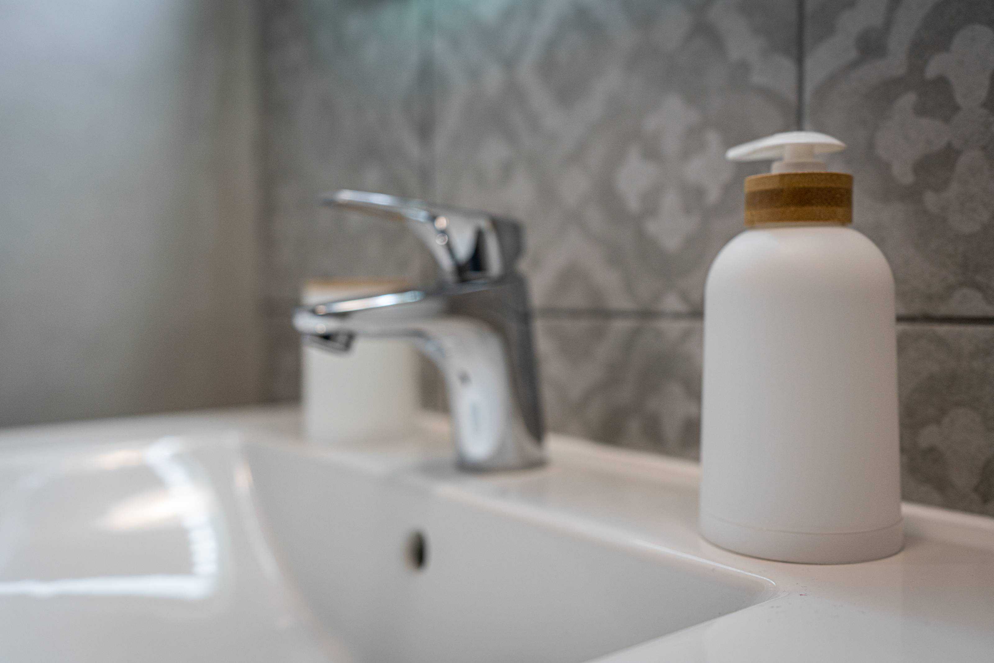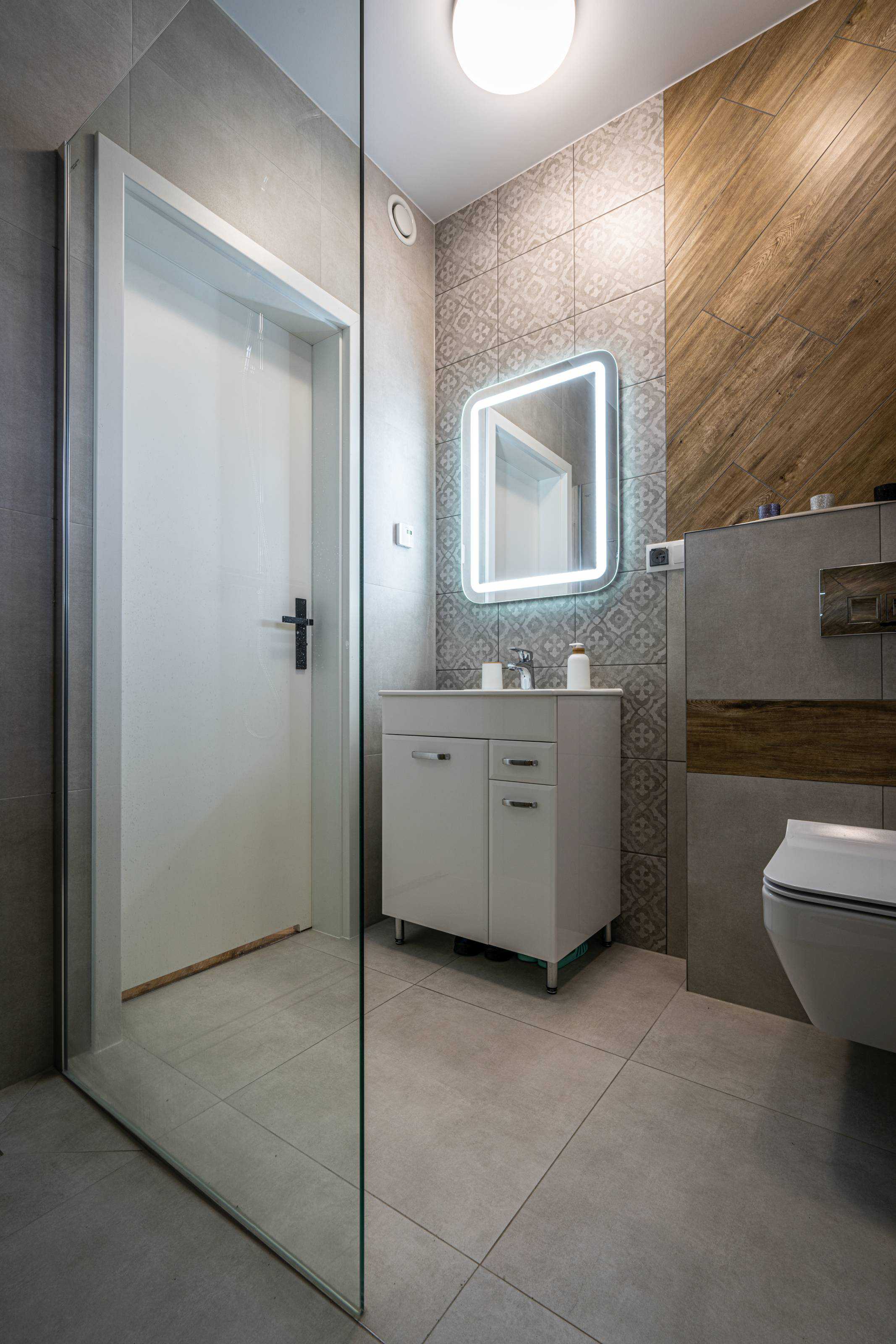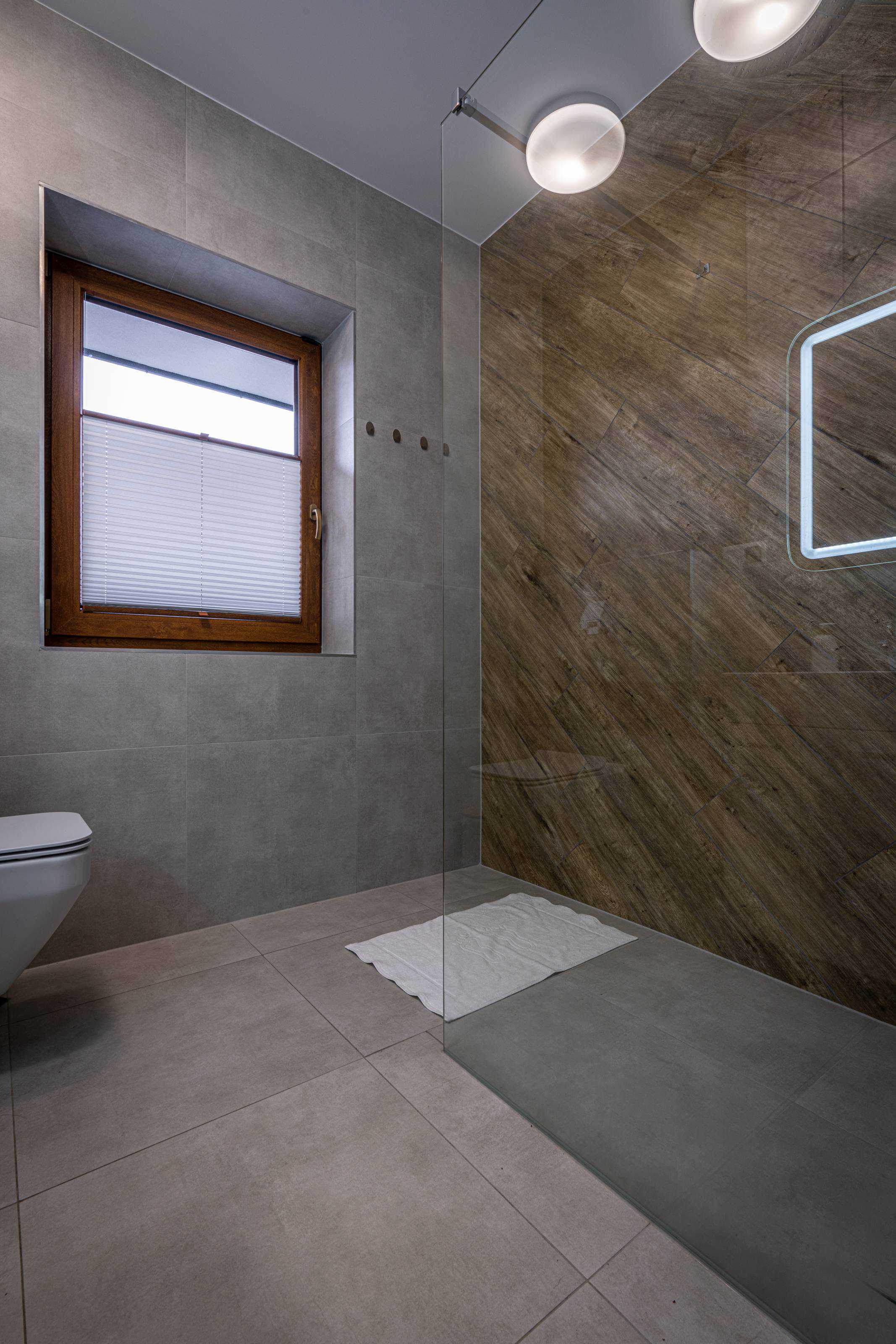 W łazience znajduje się prysznic z odpływem liniowym, suszarka do włosów, zestaw kosmetyków, ręczniki i stopka.