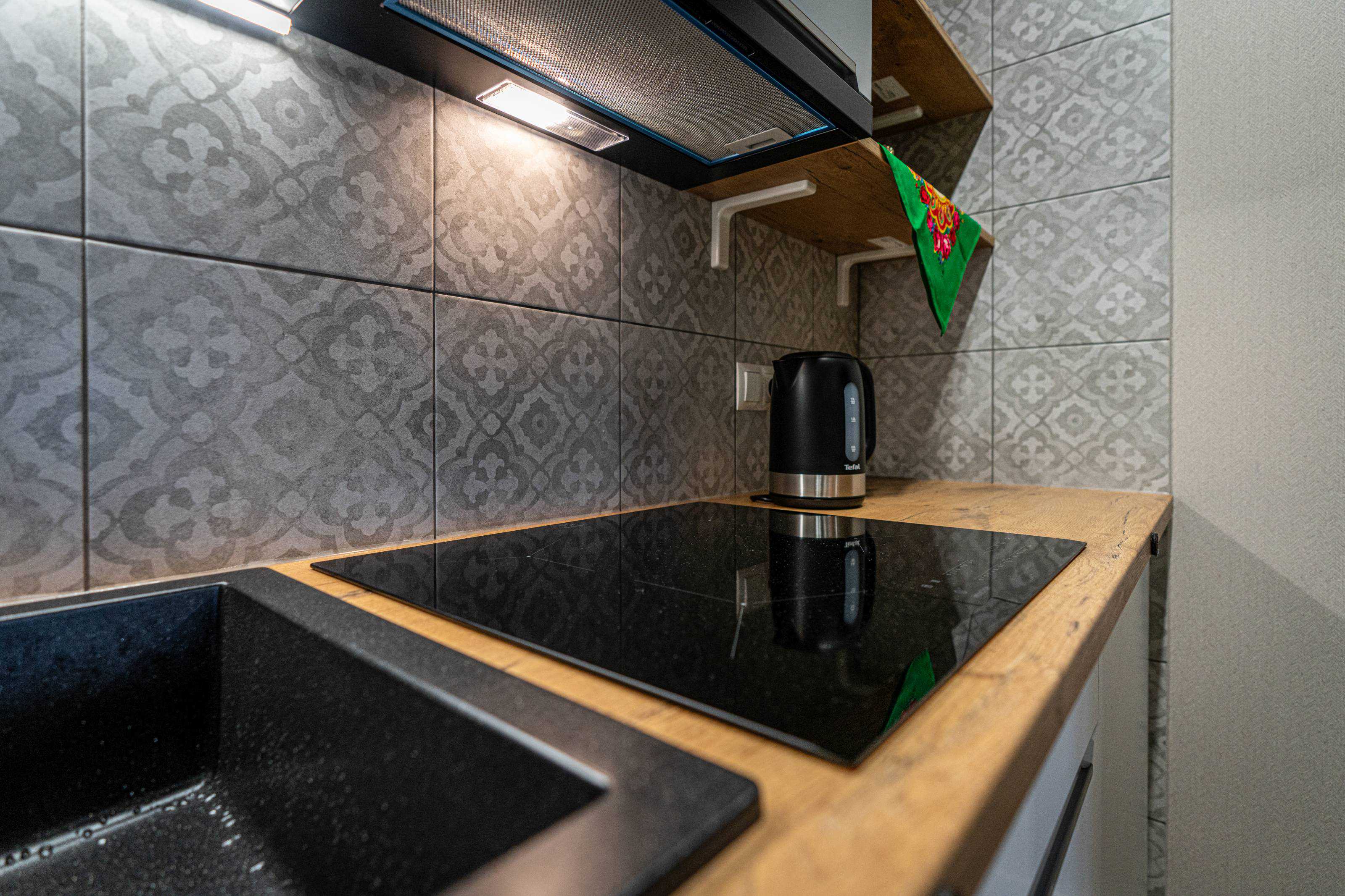lodówko zamrażarkę, czteropalnikową płytę indukcyjną, czajnik, naczynia, sztućce, garnki.